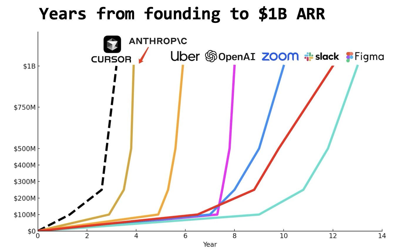 Cursor is exploding right now, and it’s worth understanding why. Cursor is an AI coding tool that replaces the entire developer workflow. Instead of jumping between GitHub, Copilot, StackOverflow, and Slack, Cursor pulls everything into one place and adds an AI partner that can write code, fix bugs, and refactor huge chunks of your codebase instantly. This means a single engineer can do the work of two or three. That’s why the adoption curve is vertical. One developer tries Cursor, sees immediate productivity gains, and then tells their entire team. There’s no training. No onboarding. It just works. And this is why Cursor is on pace to hit $1B in ARR faster than Slack, Figma, OpenAI, or any other software company in history.