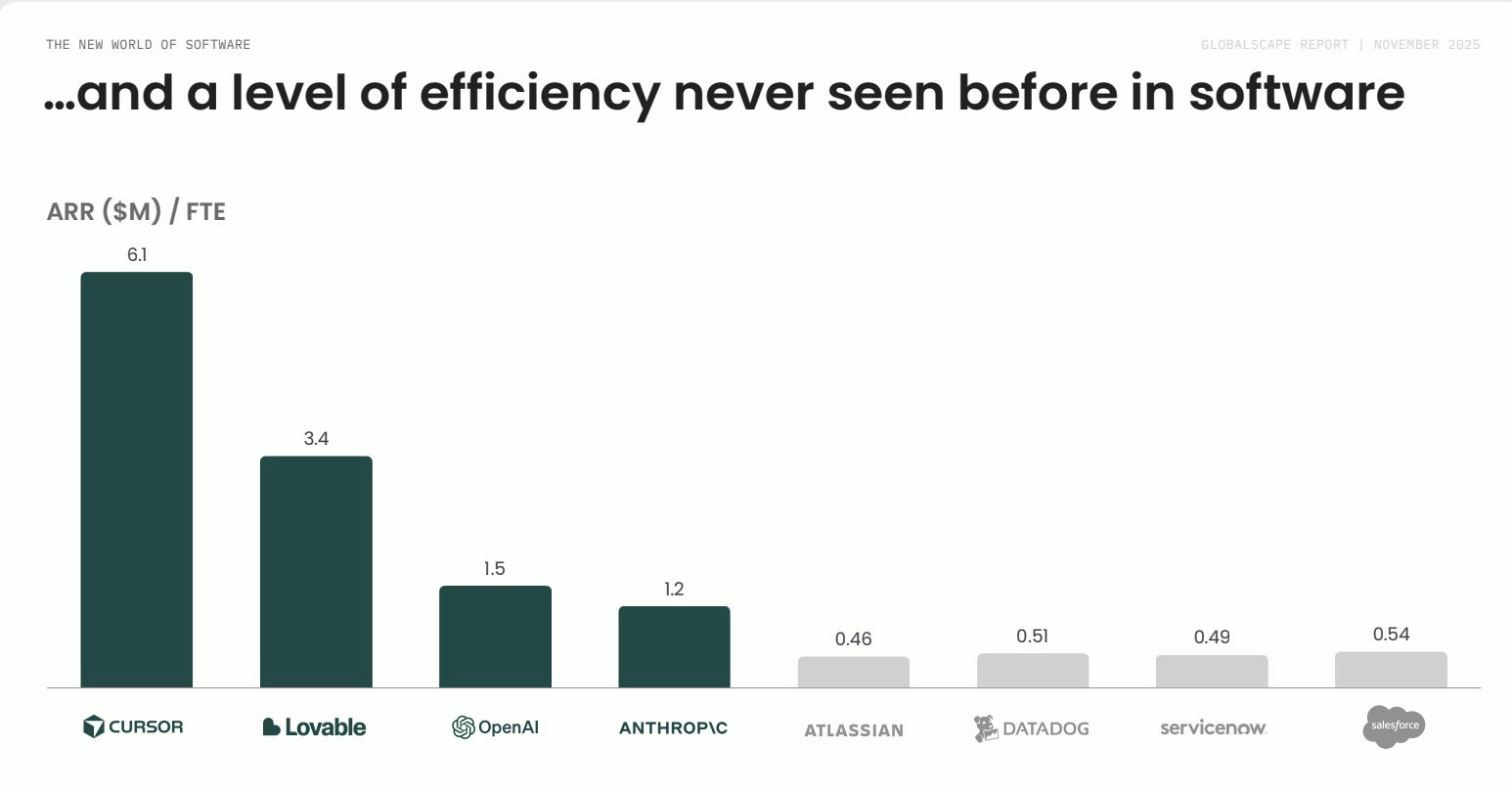 It compares how much annual recurring revenue (ARR) each company generates per employee, and Cursor and Lovable are in a completely different league from everyone else. Cursor is at $6.1M per employee. Lovable is at $3.4M. For context, the well known software companies on this chart, including Salesforce, ServiceNow, Atlassian, and Datadog, all sit around 500k per employee (still very impressive but nowhere near these AI native companies).